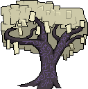 You walk through a disoriented tangle of twisting alleyways until you come to a plot of land that is barren besides a bizarre tree covered in undecipherable runes, with leaves made of parchment.